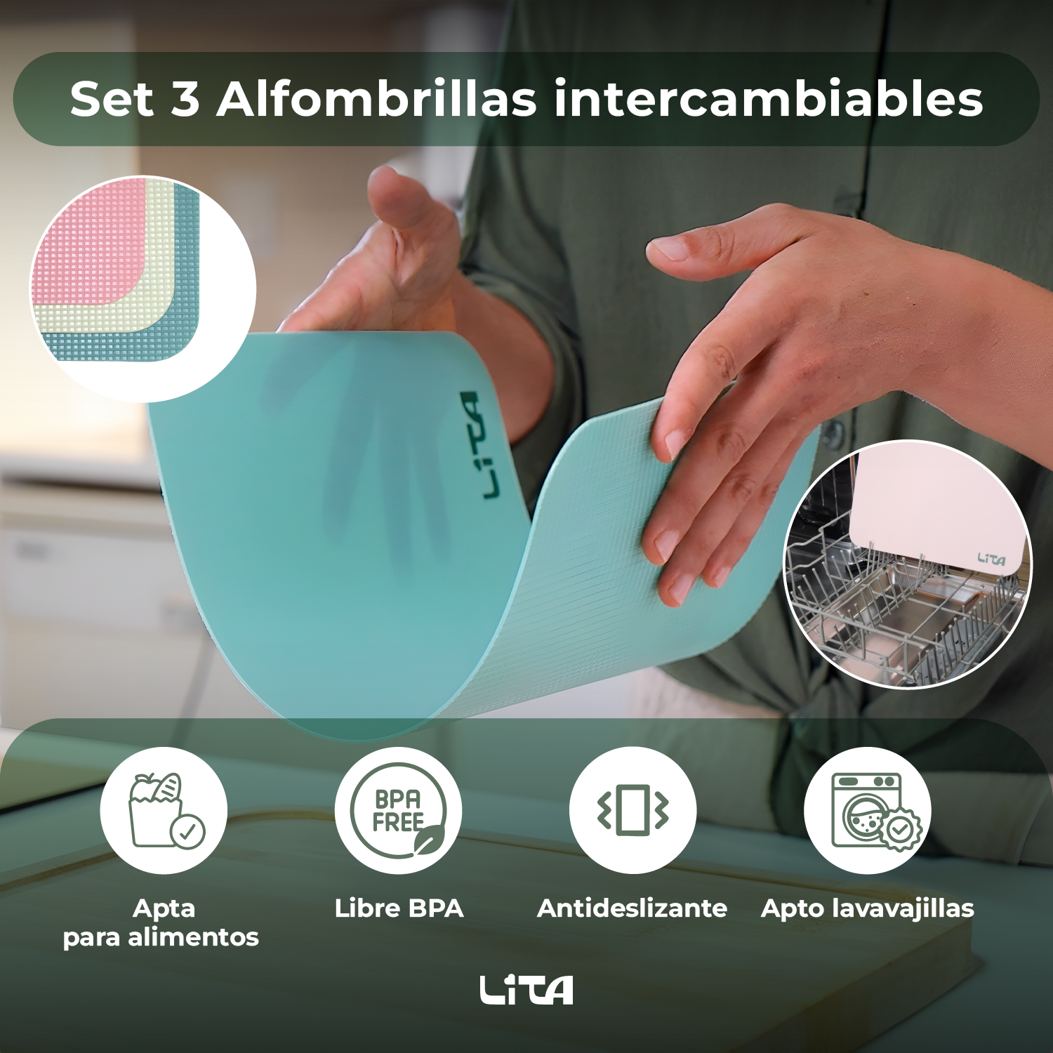 • Separación práctica: Incluye 3 alfombrillas intercambiables (carne, pescado, verduras/pan) para que nunca mezcles sabores ni bacterias. Cada alfombrilla es flexible, fácil de colocar y limpiar.