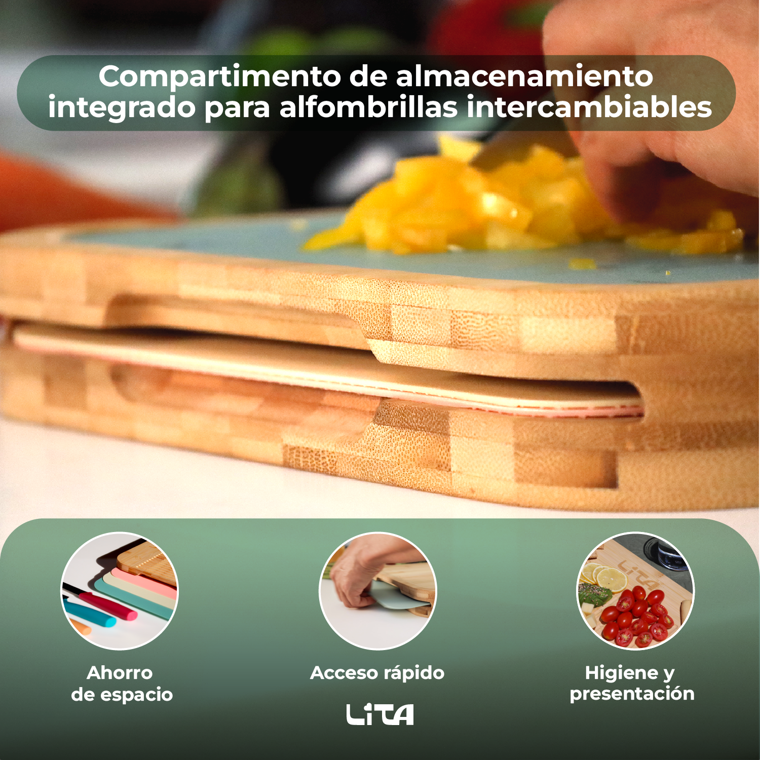 • Todo en su sitio: Guarda las alfombrillas dentro de la tabla, evita el desorden y ten siempre tu cocina lista para crear recetas.